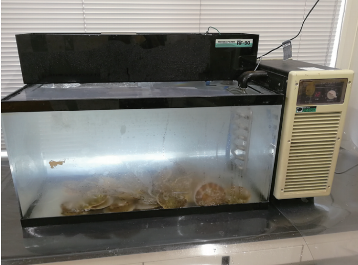 海水を十分に利用できる環境に無いラボ内で飼育する際は、90 cm アクリル水槽に一般的な観賞魚用の上部濾過システムと投げ込み式の冷却器を設置し、一時的な水槽飼育を行っている(図3)。