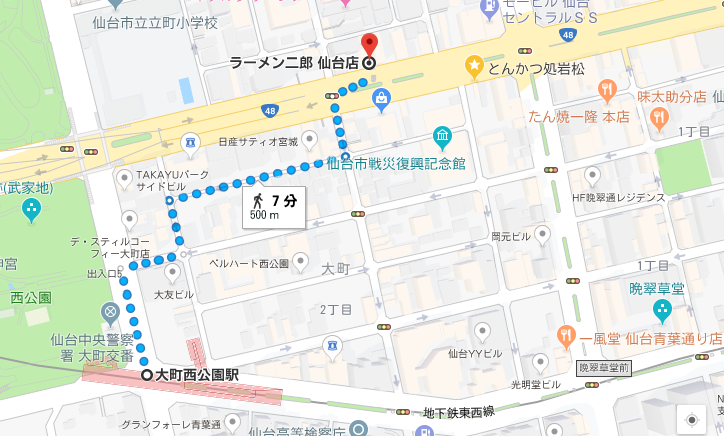ラーメン二郎仙台店は「東西線」の「大町西公園駅」から歩いて7分ほど